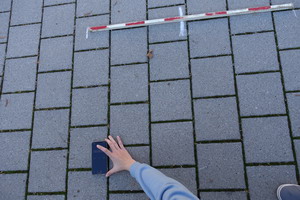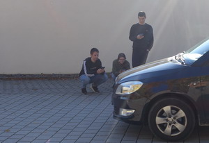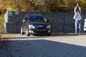 Nachdem die Trägheit des PKW mit einer Masse von ca. 900 kg auf dem unteren Parkplatz (ebene Fläche) beim Anschieben und beim Abbremsen mit einem Seil erlebt wurde, ging es nun auf den oberen Parkplatz, der eine schiefe Ebene mit konstanter Neigung darstellt und deshalb bestens geeignet ist, um eine Bewegung mit einer gleichmäßigen Beschleunigung darzustellen.
