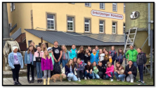 21 Schülerinnen mit den Lehrkräften Frau Vogt, Herrn Schütt, Frau Klink und Klassenmaskottchen Ratatouille sowie den Outdoorpädagogen Philipp und Stefan in „Unser Haus“ in Engstingen auf der Alb - 5 Tage, 4 Nächte - ohne Handy, wenig Privatsphäre - besondere Herausforderungen wie z.B. Küchen- und Outdooreinsätzen und eine Schlucht.
