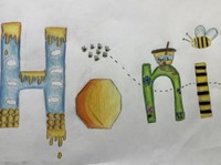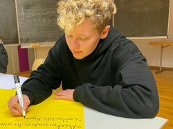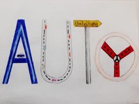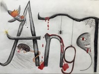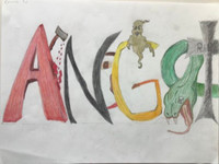 Die Klasse 9d hat sich mit Schriftbildern auseinandergesetzt. Die Schülerinnen suchten sich Begriffe aus, deren Wortinhalt sie - neben der bloßen Wiedergabe in Buchstaben- wiedergeben sollten. Technik: Buntstiftzeichnung.