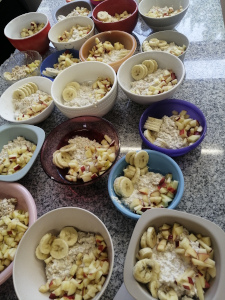 - Frühstück für die Gruppe zubereiten mit selbstgemachtem Hefezopf, Bananenbrot, Rührei, Fruchtspießen …