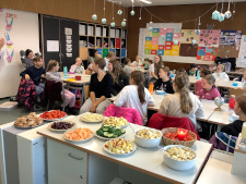 Die 5. Klassen haben mit ihren Patinnen in der KLARA- Stunde ein gesundes Frühstück zubereitet. Neben einem leckeren Müsli gab es auch Spieße aus Obst und Gemüse und das gemeinsame Arbeiten und Frühstücken hat allen viel Spaß gemacht.