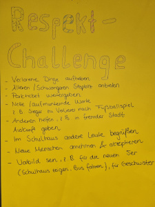 Wir wollen dabei überlegen, was dieser Begriff für uns bedeutet und Aktionen zum Thema „Respektvolles Handeln“ durchführen. Auf geht‘s mit der „Respekt-Challenge“. Allen viel Spass beim Mitmachen.