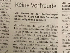 Im Deutschunterricht haben wir uns intensiv mit dem Thema Leserbrief beschäftigt.Doch wir wollten zeigen, dass das Gelernte nicht nur für die Schule relevant ist, sondern auch im "echten Leben" Anwendung findet. Gemeinsam haben wir einen Leserbrief formuliert und ihn an das Schwäbische Tagblatt geschickt. Passend zum Thema wurde unser Beitrag am 24. Dezember veröffentlicht. Wir sind stolz darauf, zu sehen, dass das, was wir im Unterricht lernen, auch außerhalb der Schule sinnvoll und nützlich sein kann!