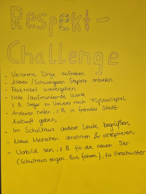 Im Zusammenhang mit dem diesjährigen Schuljahresmotto lautet "RESPEKT" hat das Seelsorgeteam St. Klara zu einer Respektchallenge aufgerufen. Zahlreiche Klassen haben ihre respektvollen Taten, welche sie dieses Schuljahr bewusster umsetzen wollen notiert und über ihre Erfahrungen dabei im Morgenkreis besprochen. Ein Beispiel der 6a seht ihr auf dem beiliegenden Bild (Danke an euch:))