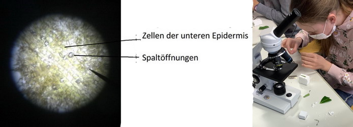 Die Schülerinnen der Klasse 7a fertigten dazu im Bio-Unterricht Querschnitte durch ein Blatt des Kirschlorbeers an.Ein Stück des Blattes wurde dabei in einen kleinen Block aus Styropor eingeklemmt, der damit als Halterung für die Anfertigung derSchnitte diente. Mit einer scharfen Rasierklinge wurde nun ein dünnerSchnitt durch das Blatt angefertigt. DieserQuerschnitt wurde auf einen Objektträger übertragen und bei verschiedenen Vergrößerungen mikroskopiert.