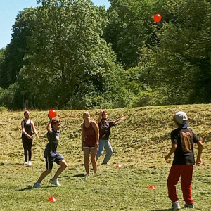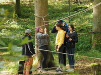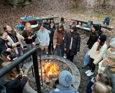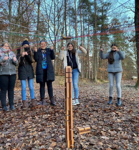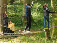 Um unseren Schülerinnen und Schülern die Möglichkeit zu geben, sich in einem anderen Rahmen als dem Schulalltag besser kennenzulernen, sind wir dieses Jahr auf die Schwäbische Alb in einen Niederseilgarten gefahren. Die Niederseile sind, obwohl sie nicht einmal in einem Meter Höhe über dem Boden liegen, eine gehörige Herausforderung für den Gleichgewichtssinn. Es war durchaus nicht einfach, sich auf ihnen entlang zu bewegen. Der gute Teamgeist, der in allen Mannschaften vorherrschte, ließ alle Gruppen den Parcour mit vereinten Kräften und guter Zusammenarbeit tatsächlich erfolgreich bewältigen. Nach dieser sportlichen Herausforderung schmeckte das Mittagessen am Lagerfeuer umso besser.
