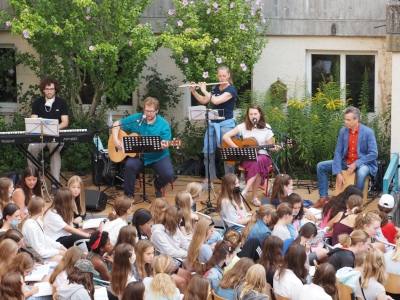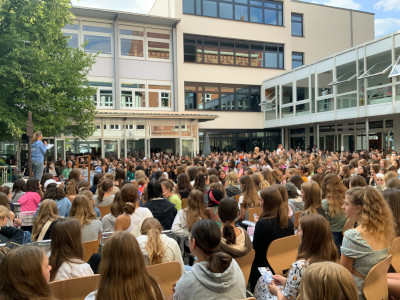 Zum ersten Mal seit Beginn der Coronapandemie konnten wir endlich wieder einen Gottesdienst mit der ganzen Schulgemeinschaft feiern. Unter freiem Himmel trafen wir uns im Schulhof zum gemeinsamen Gebet, zum Zuhören, zum Singen, zum Danken und zum Segnen.
