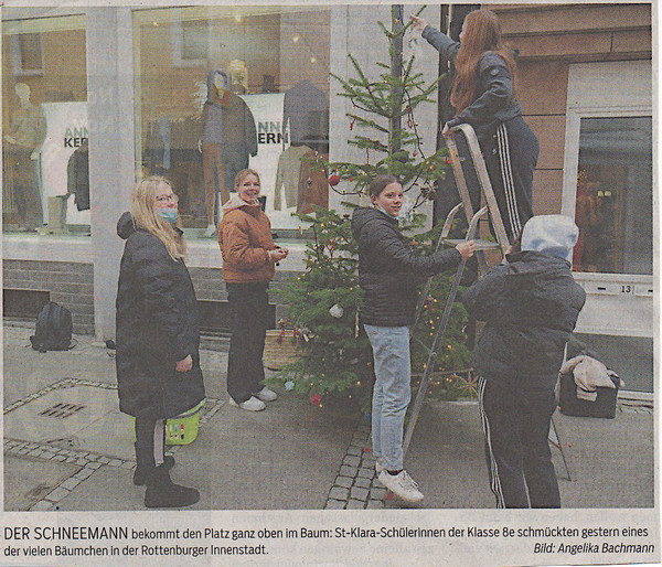 Die Klasse 8e beteiligte sich Ende November an der Aktion „Mein Weihnachtsbaum für Rottenburg“. Das Kaufhaus Innenstadt (KIR) stellte auch in diesem Jahr Tannenbäume zur Verfügung, die vom Förderverein Bad Niedernau aufgestellt und mit Lichterketten versehen worden sind. Vereine, Schulklassen oder Kindergartengruppen konnten sich bei der WTG melden und bekamen einen Baum in der Rottenburger Innenstadt zugeteilt.
