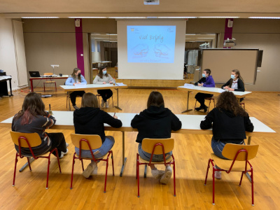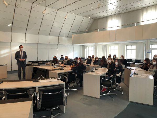 Dahingegen begaben sich die 45 Schülerinnen der zehnten Klassen mit Frau Abaroa und Frau Schiebel nach einem kurzen Aufenthalt im Stadtzentrum zu Fuß oder mit der Tram ins Europaparlament: