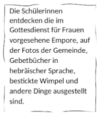 Bevor ein kurzer Film, der den zeitlichen Kontext des jüdischen Lebens in Baisingen umreißt, gezeigt wurde, sprach Frau Jauß den Schülerinnen den aaronitischen Segen, Bestandteil des jüdischen und christlichen Gottesdienstes, zu: יְבָרֶכְךָ יְהוָה וְיִשְׁמְרֶךָ Der HERR segne dich und behüte dich; der HERR lasse sein Angesicht leuchten über dir und sei dir gnädig; der HERR hebe sein Angesicht über dich und gebe dir Frieden.
