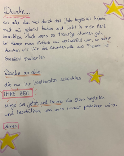 Heute schauen wir auf das Schuljahr zurück und danken dir für viele schöne Erlebnisse, für unsere Freundinnen und Freunde, für gute Noten, für Ausflüge und besondere Erlebnisse, für Bewahrung und Spaß miteinander.
