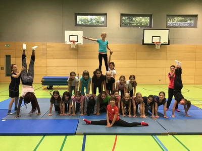Akrobatik macht unseren Fünfern Spaß! Das sieht man den strahlenden Gesichtern in der 5a deutlich an. Und was am wichtigsten ist, Akrobatik geht nur gemeinsam. Jeder trägt Verantwortung für die anderen. Man übt sich im Helfen und Sichern der Partnerinnen und ist auch dafür verantwortlich, dass durch die eigenen Bewegungen niemand verletzt wird.