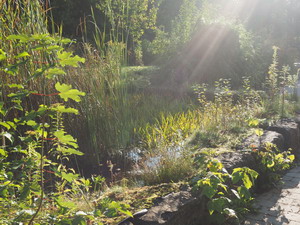 Der Schulgarten mit Teich ergänzt als perfektes Außenklassenzimmer den Biounterricht.