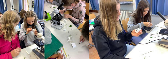 Die Schülerinnen der Klasse 7a fertigten dazu im Bio-Unterricht Querschnitte durch ein Blatt des Kirschlorbeers an.Ein Stück des Blattes wurde dabei in einen kleinen Block aus Styropor eingeklemmt, der damit als Halterung für die Anfertigung derSchnitte diente. Mit einer scharfen Rasierklinge wurde nun ein dünnerSchnitt durch das Blatt angefertigt. DieserQuerschnitt wurde auf einen Objektträger übertragen und bei verschiedenen Vergrößerungen mikroskopiert.